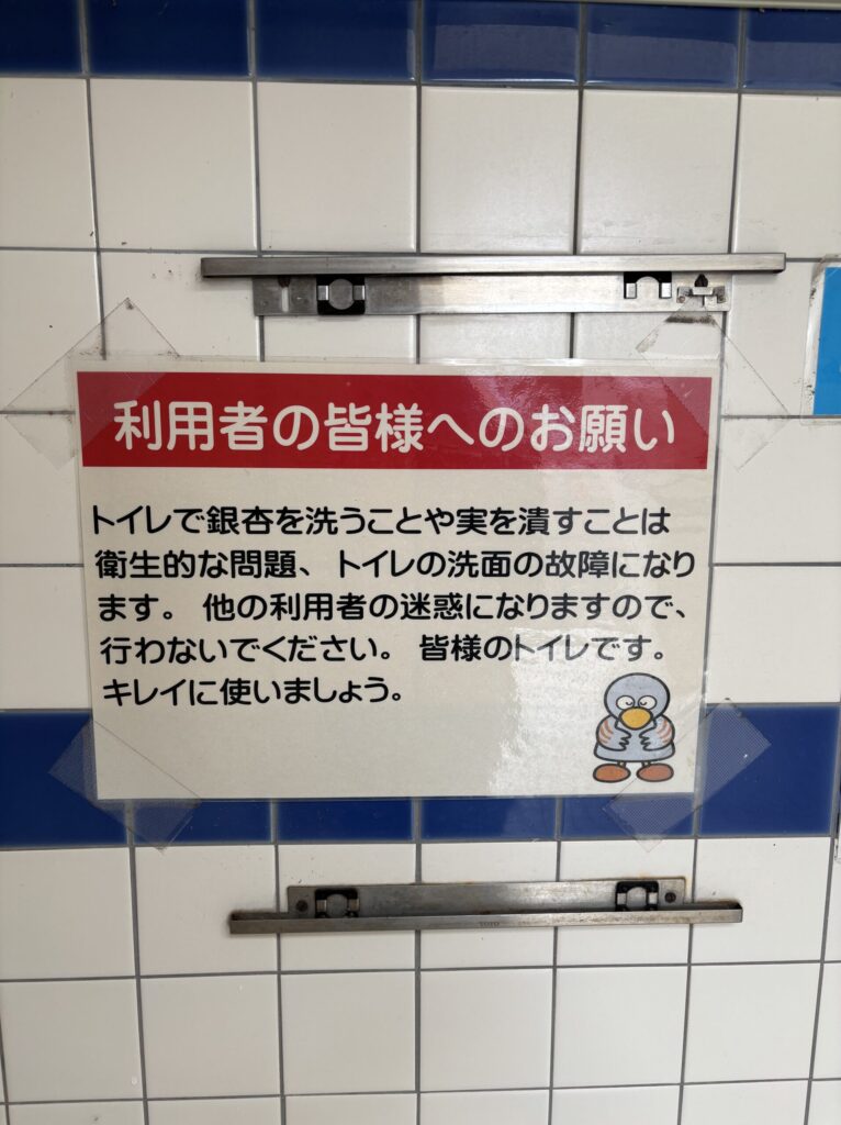 晩秋のこの時期、川水の駐車場前のトイレに張り出される注意書きがあります。