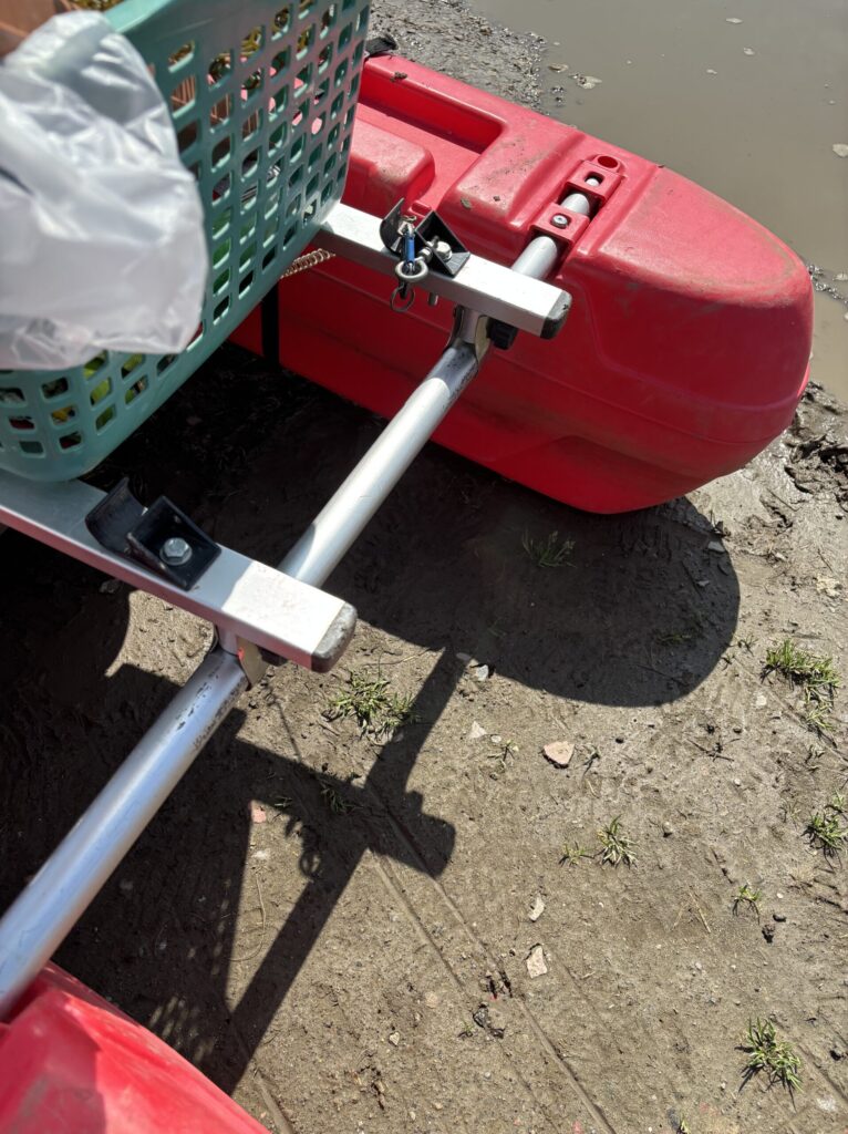ビーノのフロボのロッドホルダー(自作)はロッドのグリップ側をツールキャッチというもので挟み、ティップ側の中間点はフロボ後方のポール(イレクターパイプ)の上に乗せるという方式です。