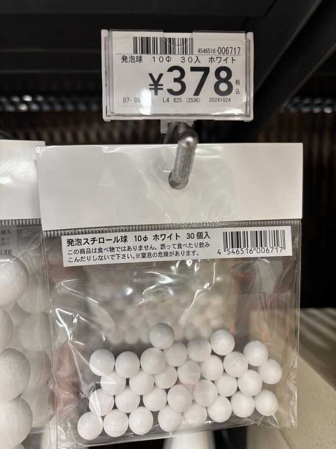 玉は発泡スチロール製の「発泡球10Φ」というのをカインズでみつけて買いました。