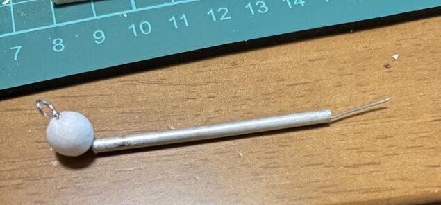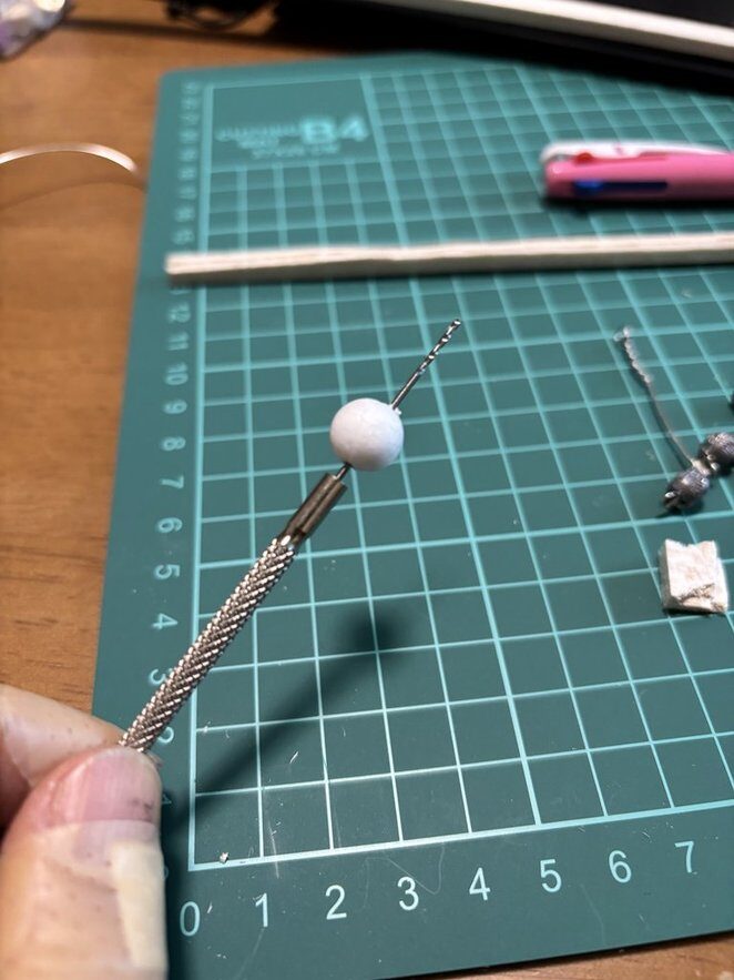 - 発泡玉に穴を開けて、片側にスクリューアイを作ったステンレスワイヤーを通します。