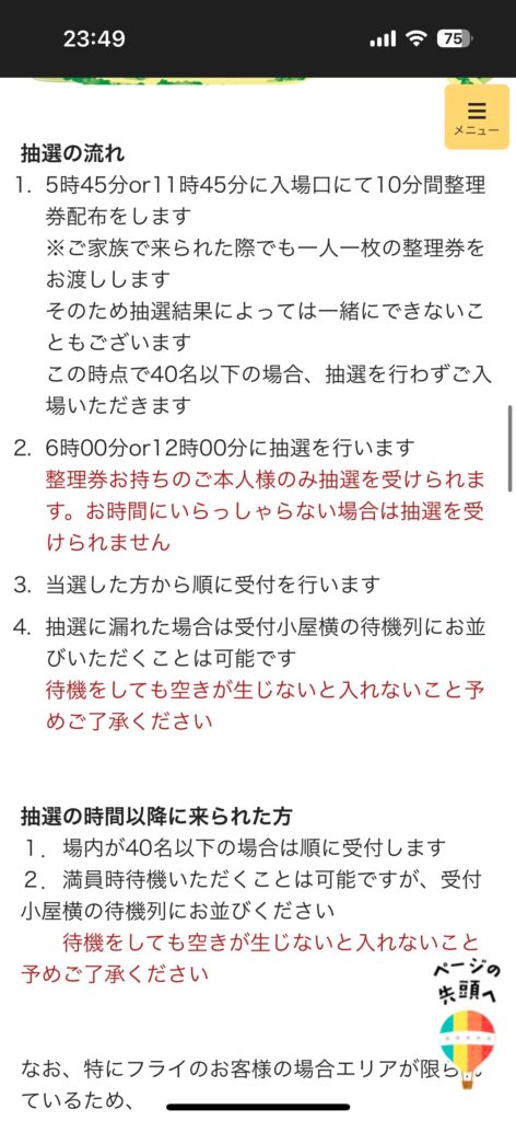 つまり、どんなに早く行って並んだとしても、抽選に外れれば入場できないのです。