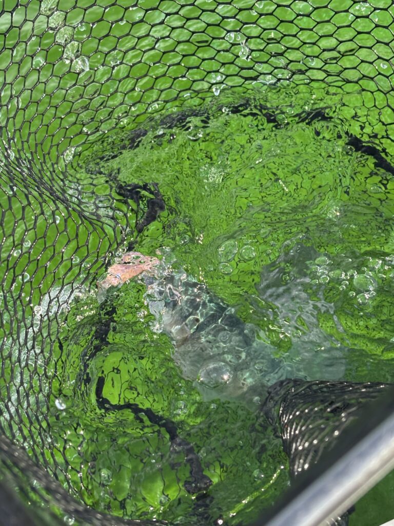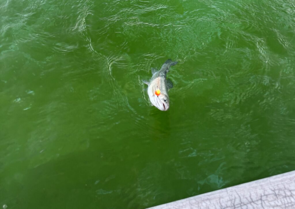 日が上がって、魚が表層を意識している様子、水質はクリア。
