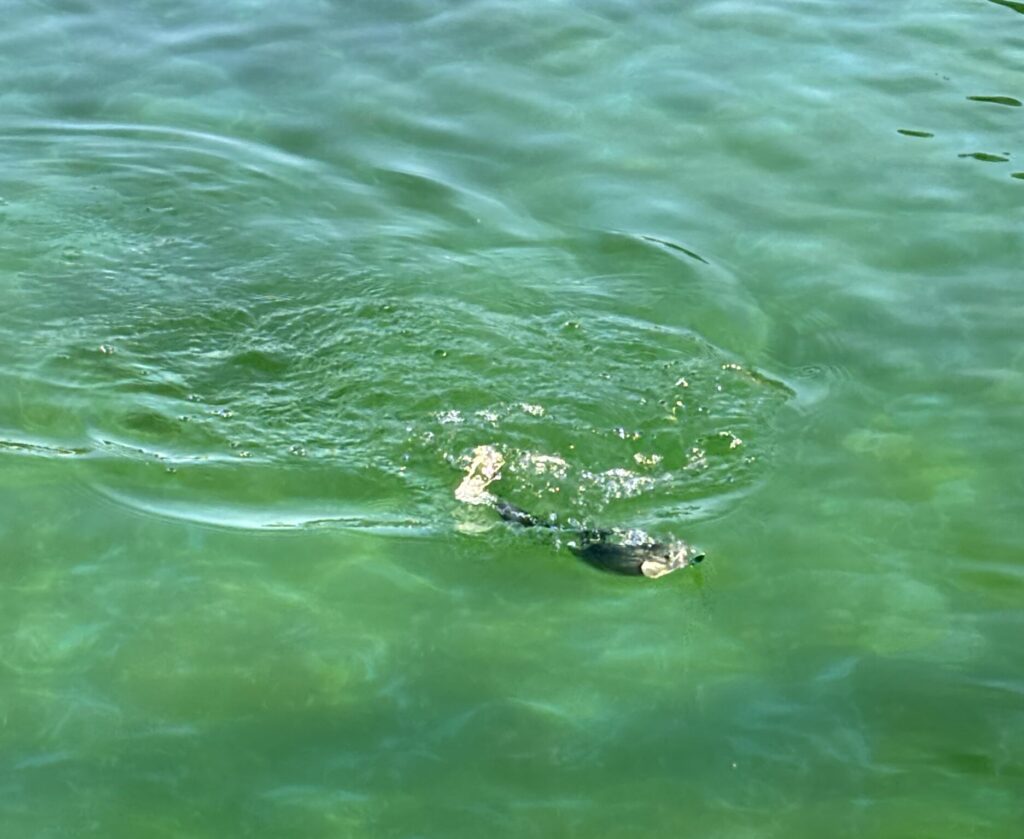 偏光グラスをしているし、水がクリアだから魚が反応しているのが見える。