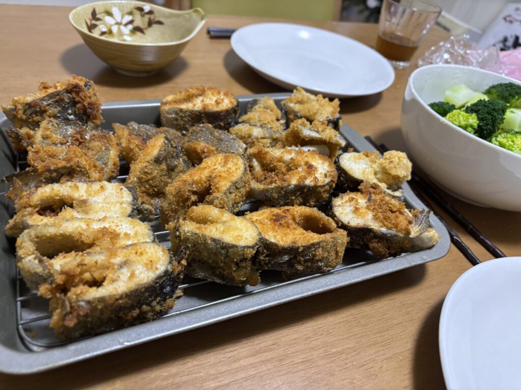 も出刃包丁でで骨ごとブツ切りにして揚げちゃうと楽ちんなんですよ。