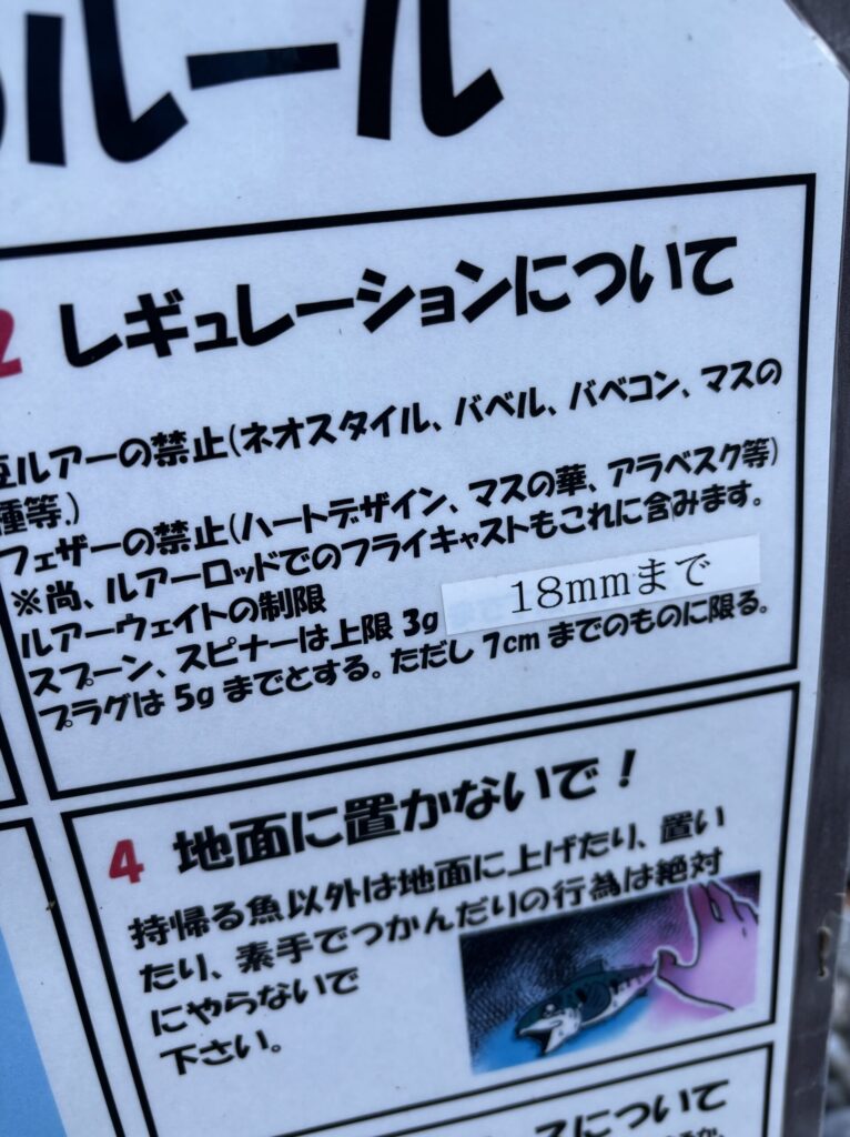 対して川では、縦・フェザーOKで、ワームや生餌はもちろん禁止ですが、普通にエリア用として使われているルアーでシングルバーブレスならば、ほぼほぼ使用可能だそうです。