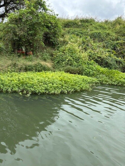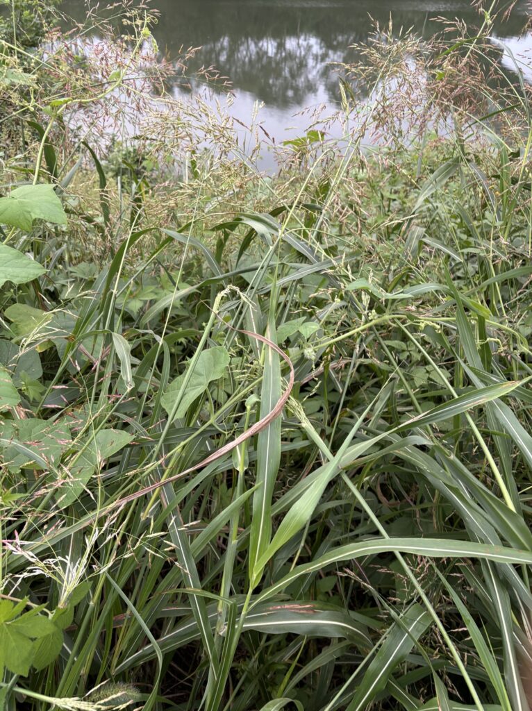 ちょっと下流のツルノゲイトウの際に入れて止めておくと、流されていたリグがふと止まります。